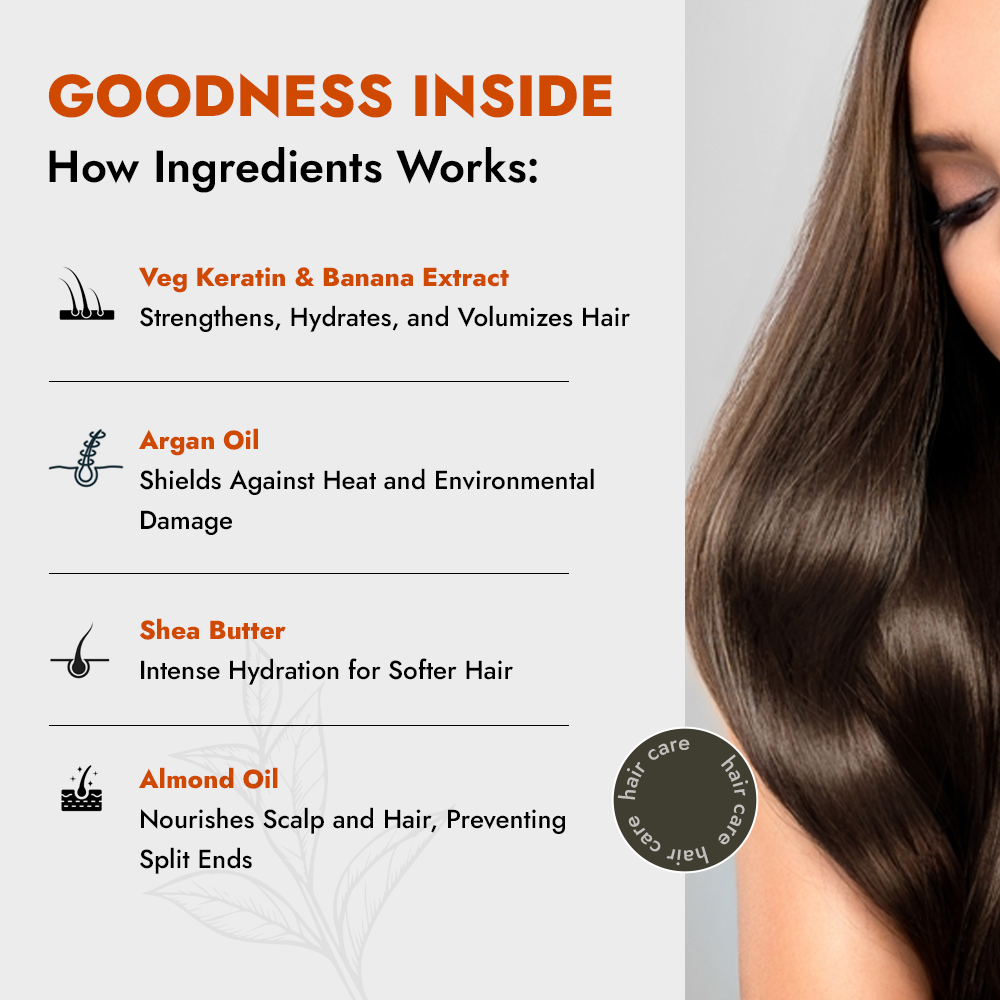 Banana Extract, a key component, provides hydration and softness to the hair, while Vitamin E acts as a powerful antioxidant, protecting it from environmental damage. The inclusion of Aloe Vera Extracts, Argan Oil, Shea Butter, and Almond Oil ensures that the hair receives essential nutrients to nourish and add volume.