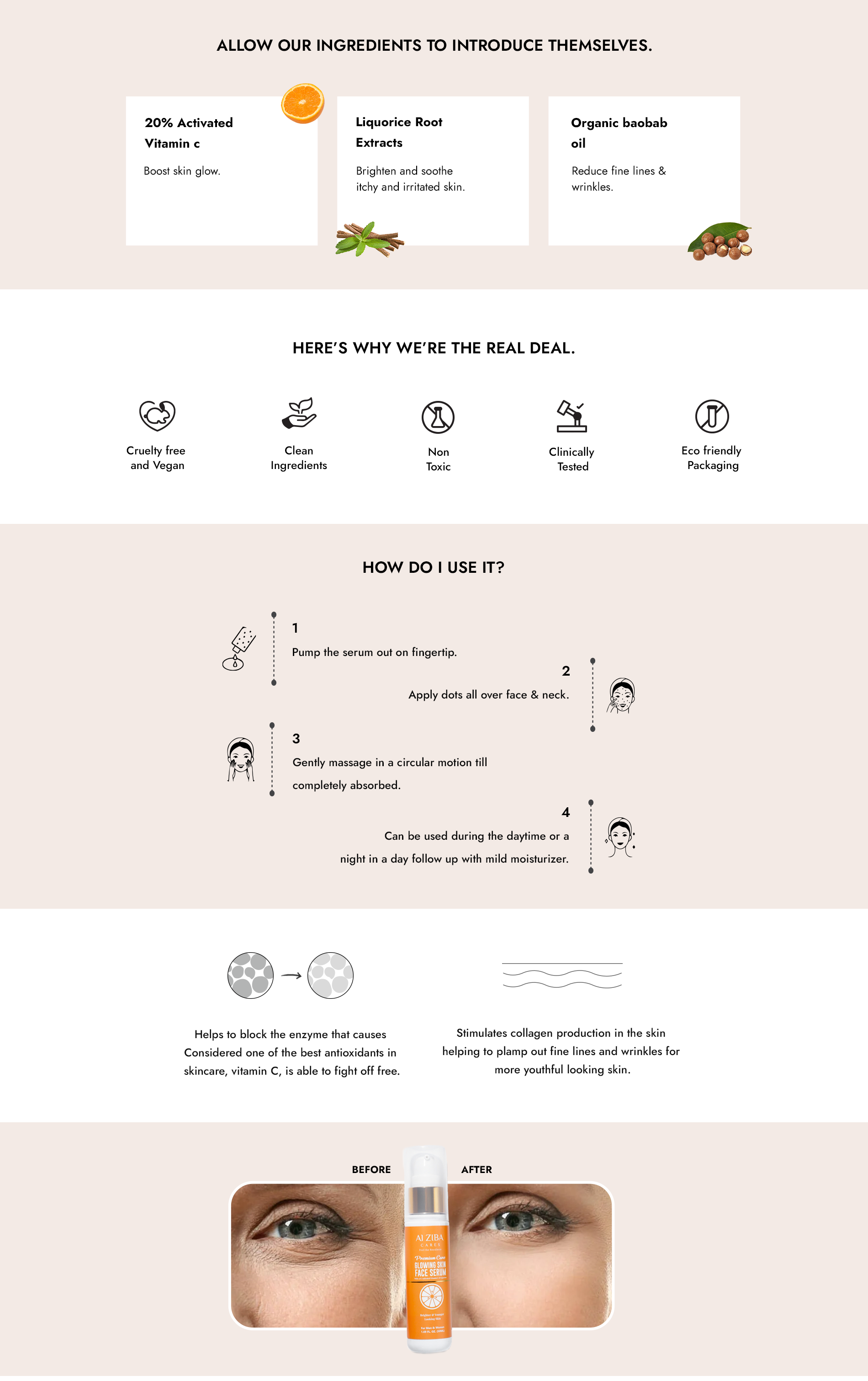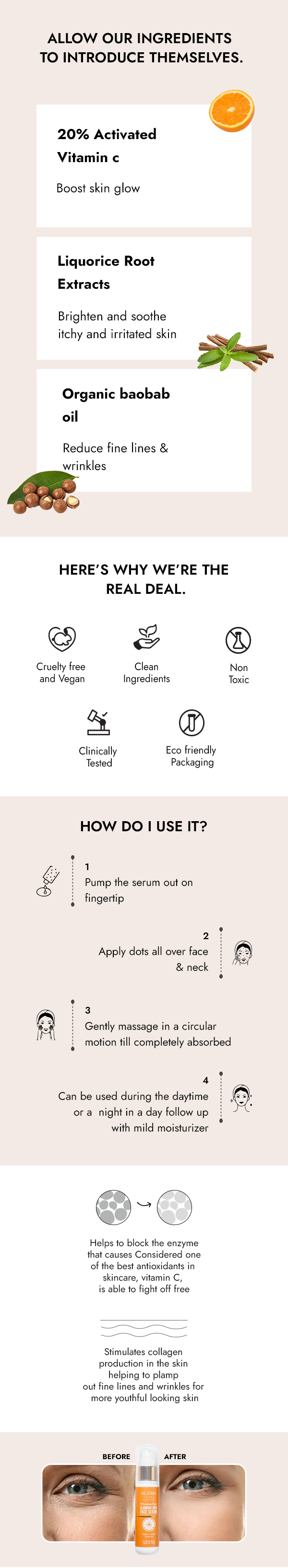 ALZIBA CARES 20% Vitamin C Glowing Face Serum with Hyaluronic & Ferulic Acid, Grape seed, Baobab oil, Licorice and Aloevera | For Glowing, Brightening & Anti Aging Skin | 50 ML | for Men and Women, All Season & all Skin Types