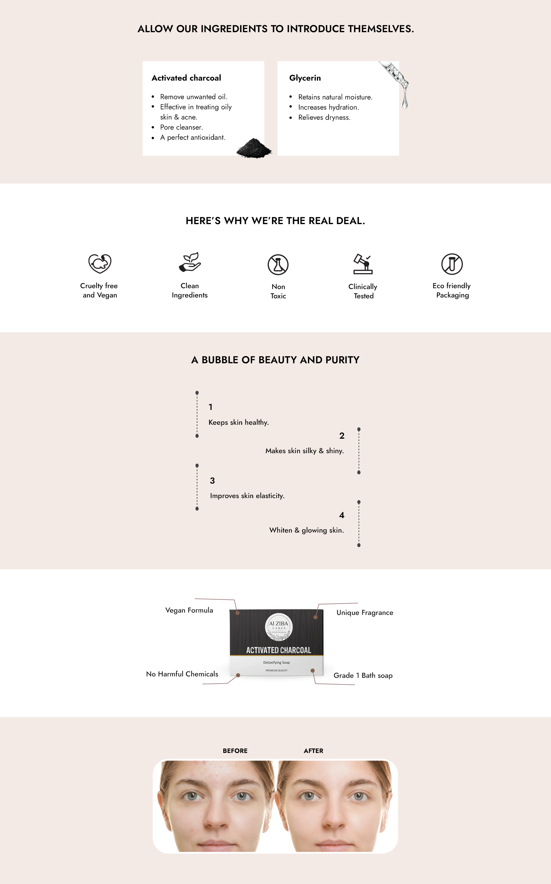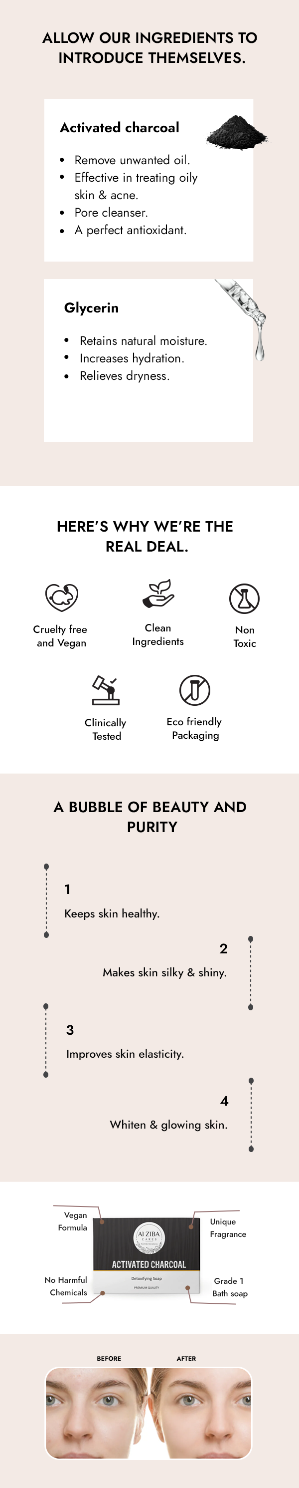 Activated charcoal is a highly absorbent material that has been utilized for many years because of its detoxifying and purifying qualities. It is a popular ingredient in skincare products for people with oily and acne-prone skin because it has the ability to soak up impurities, toxins, and excess oil from the skin. Furthermore, activated charcoal's mild exfoliating properties can effectively eliminate dead skin cells, leading to a brighter and smoother appearance. Skincare products, such as soap, that incorporate activated charcoal can be remarkably useful in eliminating impurities, toxins, and excess oil from the skin, while also providing gentle exfoliation to leave the skin looking refreshed and renewed.