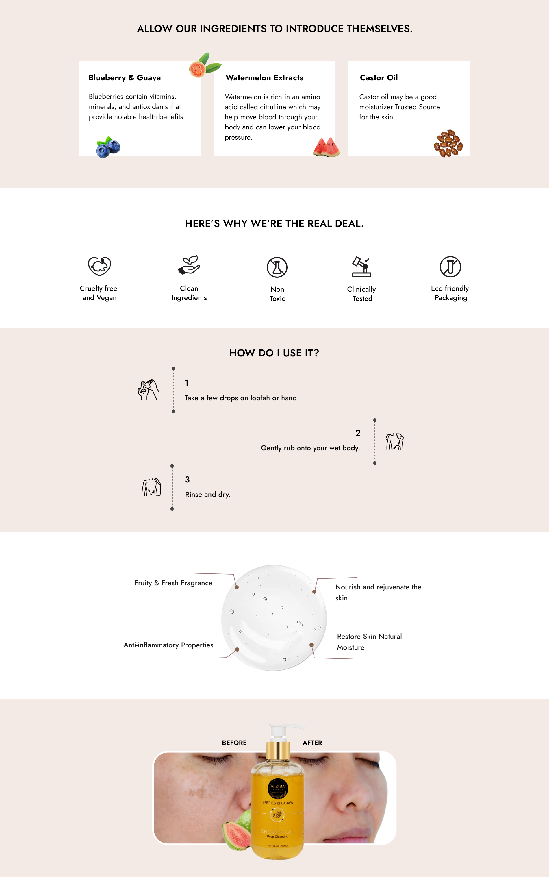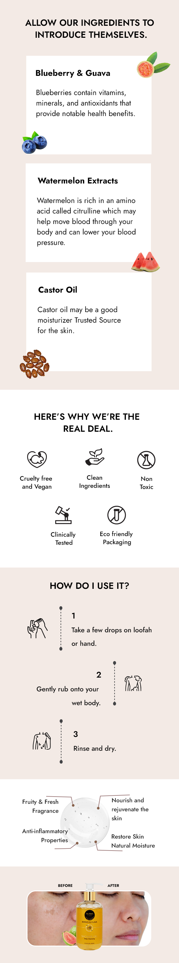 The Berries & Guava Deep Cleansing Shower Gel is a skincare product that contains fruit extracts and offers benefits for the skin. Fruits like blueberries, watermelons, and guavas are rich in antioxidants and nutrients that can aid in the repair and revitalization of the skin. This type of shower gel provides a deep cleansing action that effectively eliminates dead skin cells and impurities while simultaneously moisturizing and protecting the skin from environmental damage. Consistent use of this shower gel can lead to enhanced skin health and appearance, resulting in so, smooth, and radiant skin.
