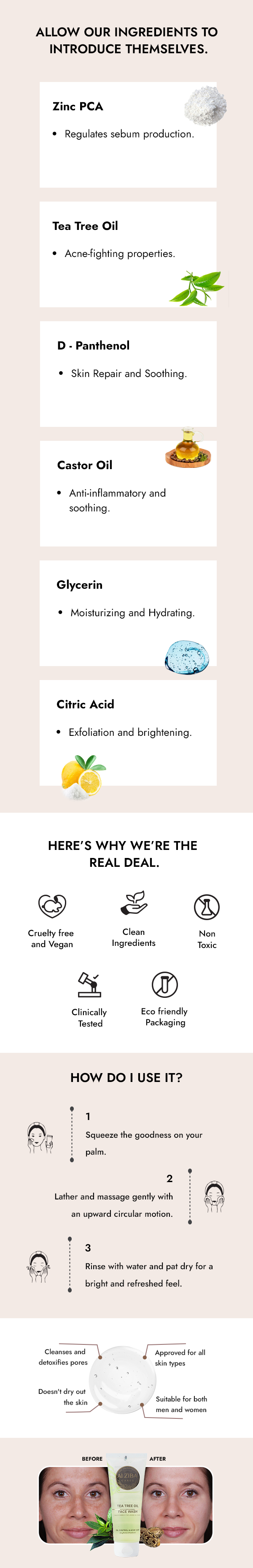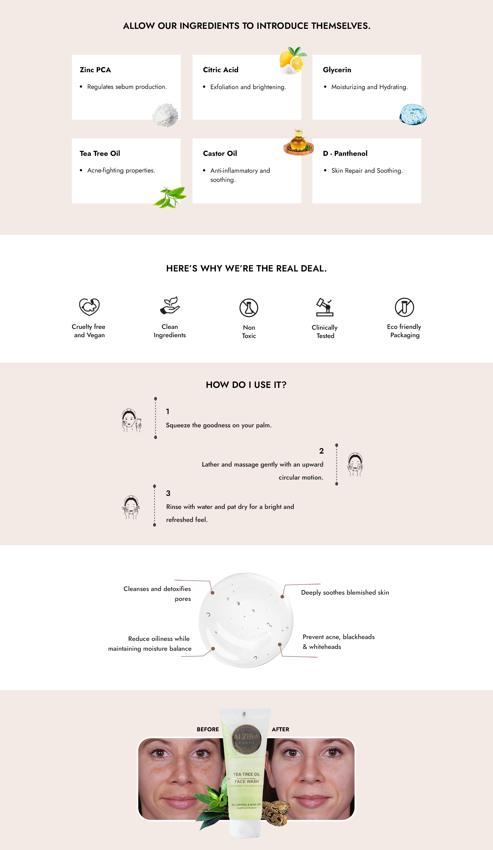 ALZIBA CARES Tea Tree Oil Face wash with Tea Tree Oil, ZINC PCA & D-Panthenol | for Acne and Oil Control, Clean and Clear Skin | 100 ML | for Men and Women, All Season & All Skin Types