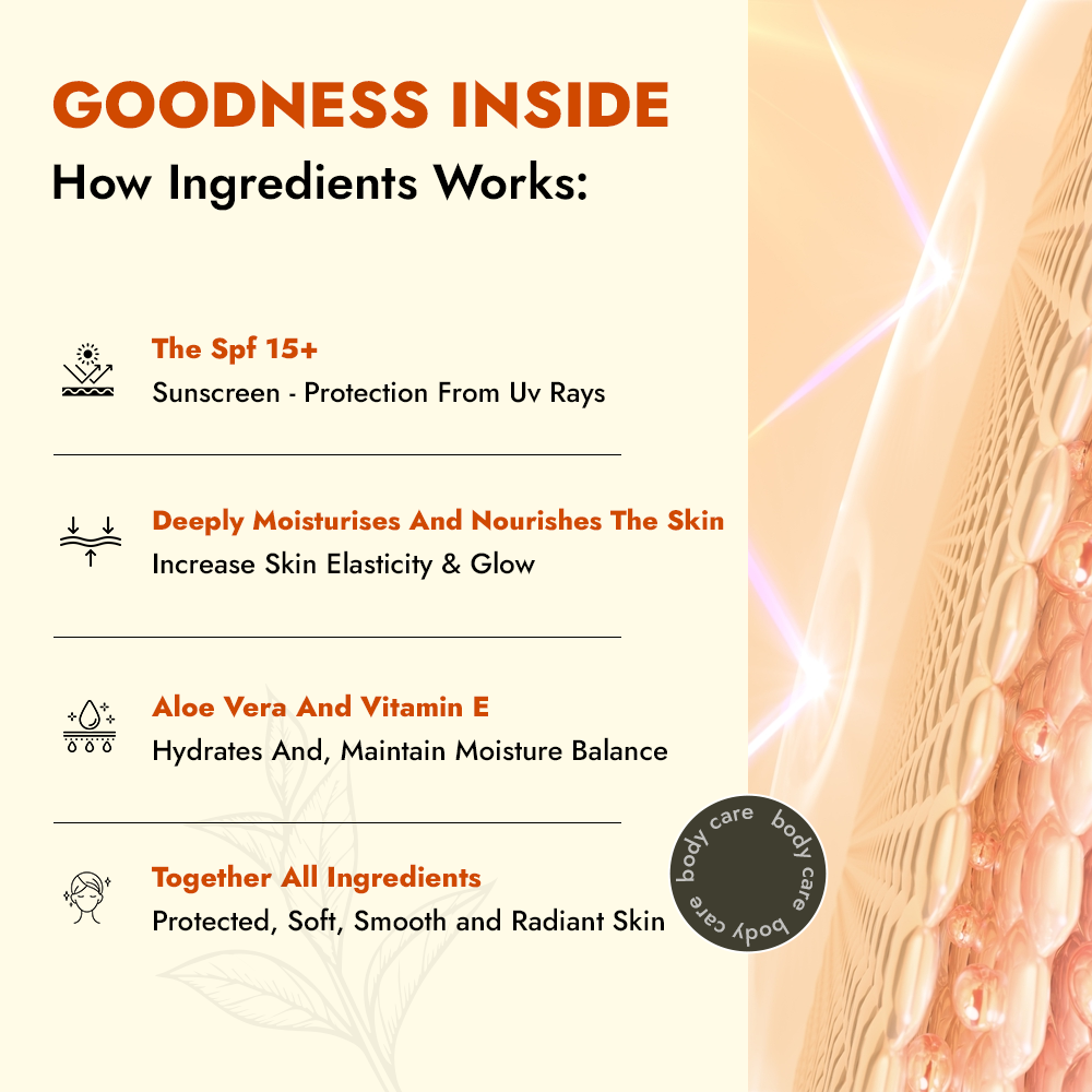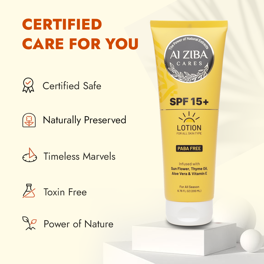 ALZIBA CARES SPF 15+ Sunscreen based Body Lotion with SunFlower, Thyme Oil, Aloe Vera and Vitamin E | For Protection, Hydration and Moisturization | 200 ML | For Men and Women & All Skin Types